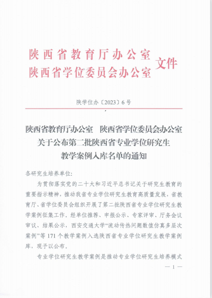 为贯彻落实党的二十大和习近平总书记关于研究生教育的重要指示精神,推动我省专业学位研究生教育高质量发展,省教育厅、省学位委员会组织开展了第二批陕西省专业学位研究生教学案例征集工作。经学校推荐、申报公示、专家评审、厅务会议审议、结果公示,我校两项教学案例入选陕西省专业学位研究生教学案例入库名单。