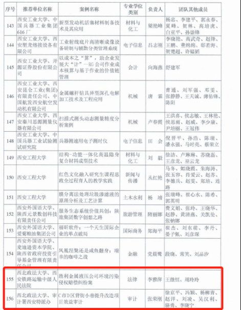 我校由张荣刚主持,徐京平、冯颖、杨柳青、赵洋、刘凌、吴汉利、骆勇、李晓宁参与的教学案例《CD区背街小巷提升改造项目审计》和由李雅萍主持,王继恒、周玲玲参与的教学案例《胜利金属液压公司环境污染侵权赔偿纠纷案》同时入选为第二批陕西省专业学位研究生教学案例入库名单。