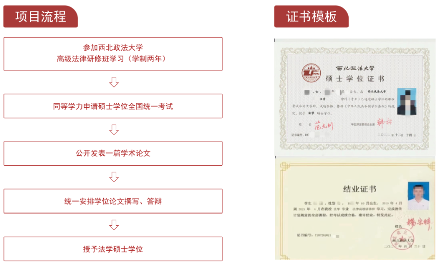 高级法律研修班学制两年,修完全部课程,成绩合格者即可结业,颁发“西北政法大学高级法律研修班结业证书”,证书统一编号加盖学校钢印、红印及校长印。获得高级法律研修班结业证书后,符合学士学位证书满三年或者硕士、博士学位满一年即可参加每年5月份“同等学力人员申请硕士学位全国统一考试”。若考试成绩合格,且独立公开发表一篇学术论文、并顺利通过硕士学位论文撰写、答辩等条件,方可申请获得西北政法大学法学硕士学位证书。