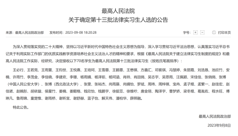 近日,最高人民法院公布了第十三批法律实习生人选名单,欧乐影视 有3名研究生成功入选,分别是法学理论专业2021级硕士研究生王雪蓉、法律(法学)专业2022级硕士研究生赵佳宏、法律(法学)专业2022级硕士研究生蓝子怡。