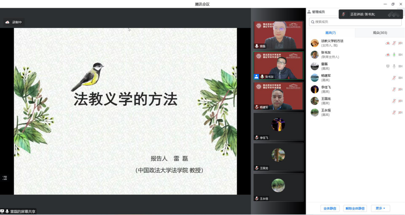 10月20日晚上19:30由西北政法大学科研处、发展规划与学科建设处主办法学理论学科、法治文明与社会治理校级研究基地协办西北政法大学法学理论学科学术讲座暨西北政法大学建校85周年系列学术讲座在线上举行。中国政法大学法学院副院长雷磊教授做题为《法教义学的方法》讲座。讲座由西北政法大学欧乐影视 副院长张书友副教授教授主持,杨建军教授、王国龙教授、李佳飞博士、王永恒博士与谈。校内外300余人参加讲座。