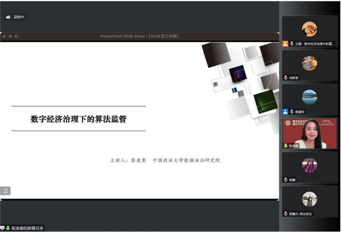 10月28日晚19:30,由西北政法大学科研处、发展规划与学科建设处,欧乐影视 主办,法学理论学科、法治文明与社会治理校级研究基地协办的西北政法大学建校85周年系列学术讲座暨法学理论学科学术讲座第4期在线上举行。中国政法大学法学院博士生导师张凌寒教授做题为《数字经济治中的算法监管》讲座。讲座由西北政法大学欧乐影视 杨建军教授主持,倪楠教授、肖新喜教授、杨锦帆副教授、国瀚文博士与谈。校内外300余人参加讲座。