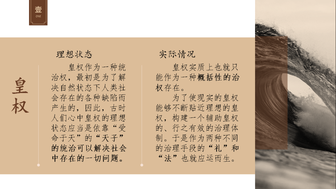 关于皇权。中国很早就产生了皇权的概念,类比洛克《政府论》中对于政治社会起源的阐述,皇权作为一种统治权,最初是为了解决自然状态下人类社会存在的各种缺陷而产生的,因此,古时人们心中皇权的理想状态应当是依靠受命于天天子的统治可以解决社会中存在的一切问题。然而,由于天子本人仍然是人,无法实然上达到溥天之下,莫非王土;率土之滨,莫非王臣这样事无巨细、近乎于神的绝对控制,皇权实质上也就只能作为一种概括性的治权存在。那么,为了使现实的皇权能够不断贴近理想的皇权,构建一个辅助皇权的、行之有效的治理体制迫在眉睫,也就应运而生,《新唐书·刑法志》开篇提出导之以德,齐之以礼作刑书两种不同的治理手段,正说明了之于皇权的工具性。