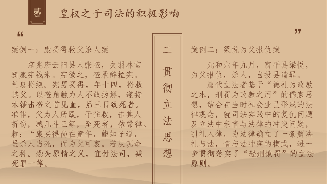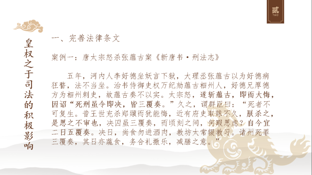 唐代司法制度虽不如当代那么科学完善,但已然形成了一个比较完整有效的逻辑机制和运行体系,能够一定程度上处理和解决社会上存在的问题和纠纷。当皇权凭借其至高无上的地位介入司法时,究竟会对司法产生怎样的影响和改变?我们将在第二部分影响状况分析中结合案例作进一步探究。