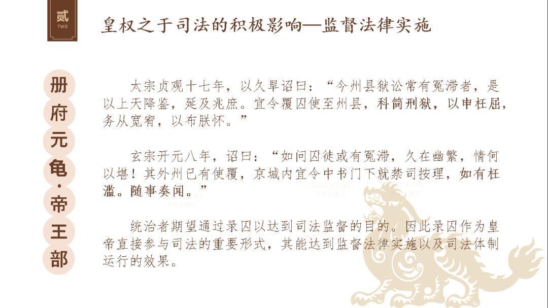 第三,监督法律实施。因皇帝具有概括的治权,司法权必然是皇帝行使权利的一个重要内容,但皇帝并不参与日常的司法工作,其对司法权的掌控往往通过录囚制度实现。
