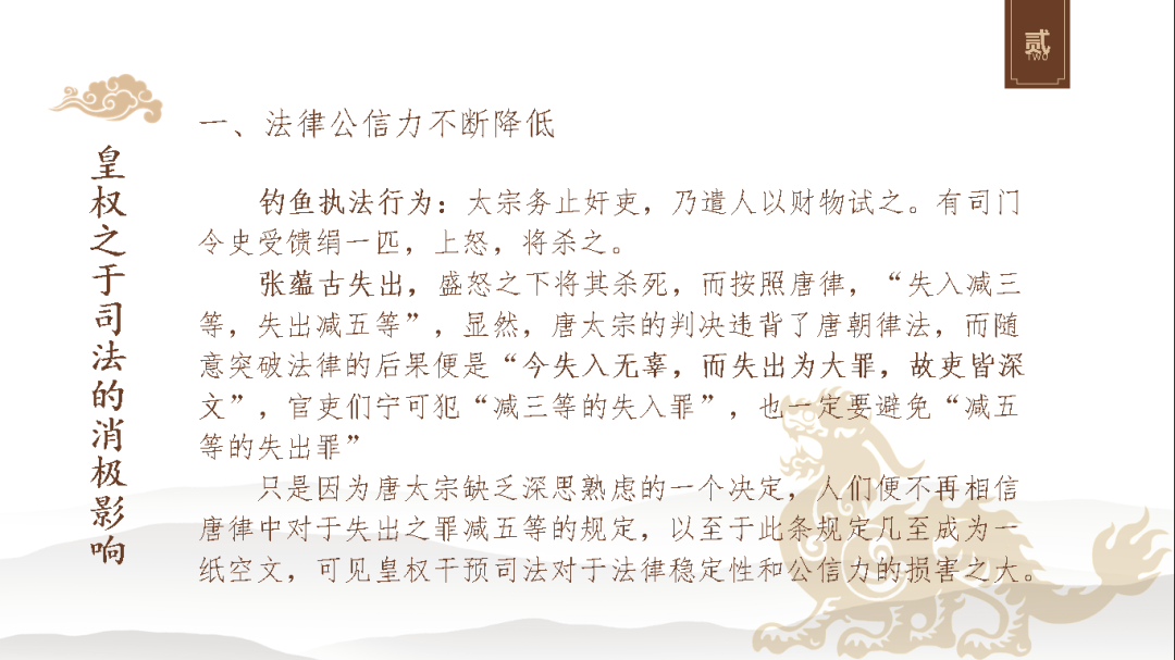 其一,皇权干涉司法会导致法律的公信力不断降低。慎乃出令,令出惟行,弗为反,司法秩序需要严格遵守、反复践行才能树立起在民众心中的权威和信仰。皇权却常常以极为强势的态度干扰司法,贞观初年甚至出现了太宗务止奸吏,乃遣人以财物试之。有司门令史受馈绢一匹,上怒,将杀之的钓鱼执法行为。正是皇权能够如此肆无忌惮地影响司法,才导致皇权在改变司法审判结果的同时,不可避免地带来了法律的混乱失序和人民之于法律信任感的降低。
