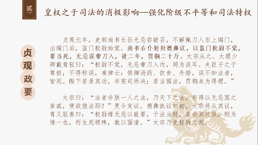 其二,皇权干涉司法会强化阶级不平等和司法特权。中国古代社会是父权家长制下的社会,皇权则是父权在观念上的延伸,所谓父者,子之天也。天者,父之天也,天子受命于天,皇权至高无上,有着与生俱来的身份特权和等级秩序,当皇权介入司法,审判结果也就不知不觉地强化着等级特权。《贞观政要》记载的长孙无忌带刀案中唐太宗对于长孙无忌和监门校尉截然不同的态度也反映出这一问题: