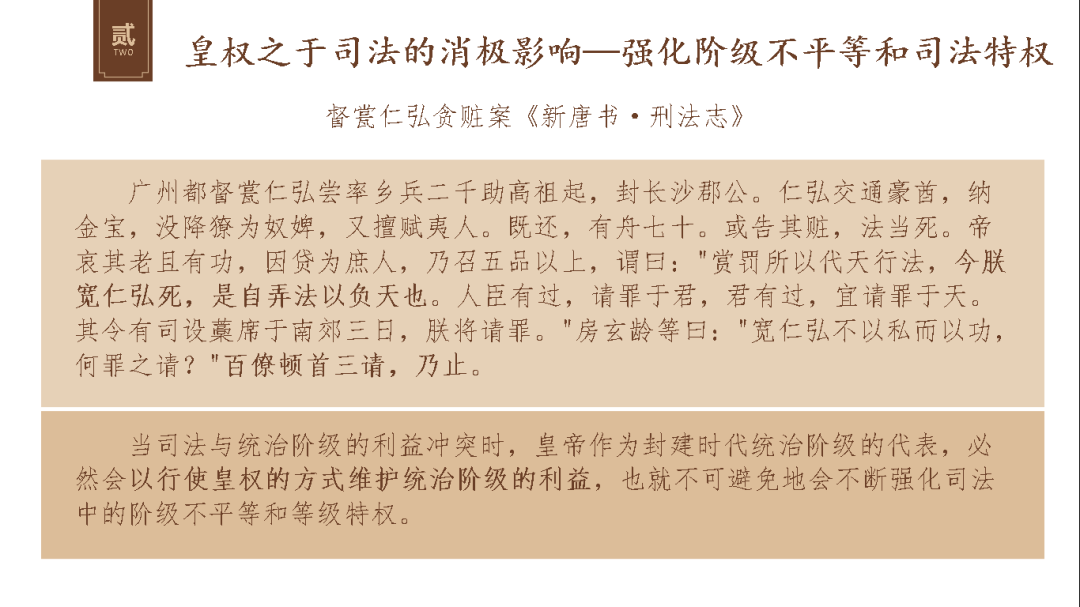 法律是统治阶级意志的体现,当司法与统治阶级的利益冲突时,皇帝作为封建时代统治阶级的代表,必然会以行使皇权的方式维护统治阶级的利益,也就不可避免地会不断强化司法中的阶级不平等和等级特权。