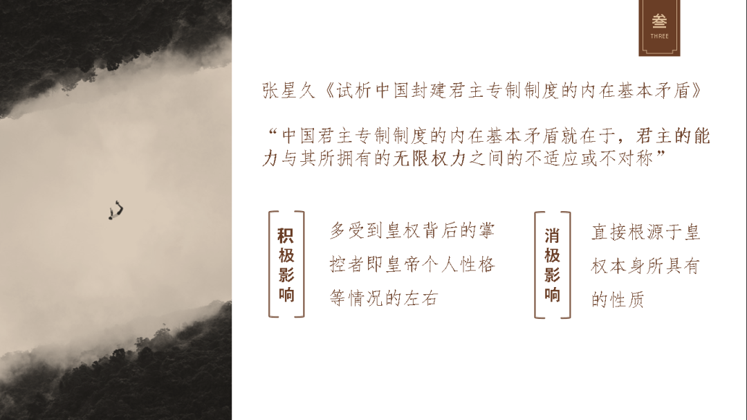 张星久在《试析中国封建君主专制制度的内在基本矛盾》一文中指出,中国君主专制制度的内在基本矛盾就在于,君主的能力与其所拥有的无限权力之间的不适应或不对称,也就是说,皇权本身就存在皇帝个人能力与皇权权力性质不对称的矛盾,结合我们对于皇权影响司法状况的研究,我们认为:皇权对于司法的影响是双向的,既有积极促进的一面,也有消极破坏的一面,但整体来看,积极影响更多受到皇权背后的掌控者即皇帝个人性格等情况的左右;消极影响则更多直接根源于皇权本身所具有的性质。