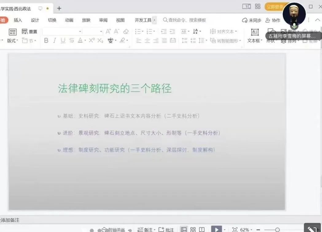李雪梅教授的讲座分为三部分:中国政法大学的碑石研究课堂、学术氛围和研究能力以及以石研究古代法制示例。
