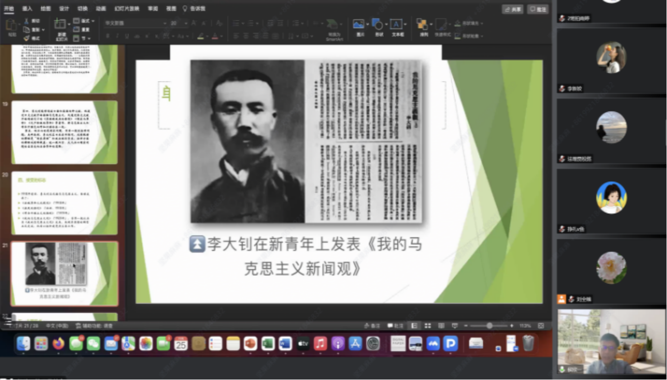 侯欣一教授以生平为起始,以影响为结束,从七个方面对于本次课题进行了系统梳理和深度解析。首先侯教授以李大钊的生平为线,通过从相关著作文集中摘录的选段带领师生回望其在思想上逐渐转变的过程。接下来从思想方面解释为什么李大钊同志会从一个宪政主义者转变为一个革命者,并强调在《新青年》与陈独秀等人的共事经历对于李大钊的价值观念与思想产生了巨大影响。在第三个部分中,侯教授又从多个方面解释了李大钊实现身份与思想转变的可能性以及合理性,特别指出李大钊儿时家境清贫是其关注底层民众,孜孜以求如何改变民众无权现状的重要原因之一,同时对于民国初年政治现状的失望及其自身拥有日语、英语等外文能力,同样是使李大钊转变思想的重要原因。接下来侯教授还对李大钊著作中的法律思想进行了介绍,例如“法律是属于已从与经济基础之上的上层建筑。”等,并阐明其对于近代法制发展做出了不可忽略的贡献。最后对于李大钊在国内传播共产主义思想的途径也进行了非常明晰的梳理。