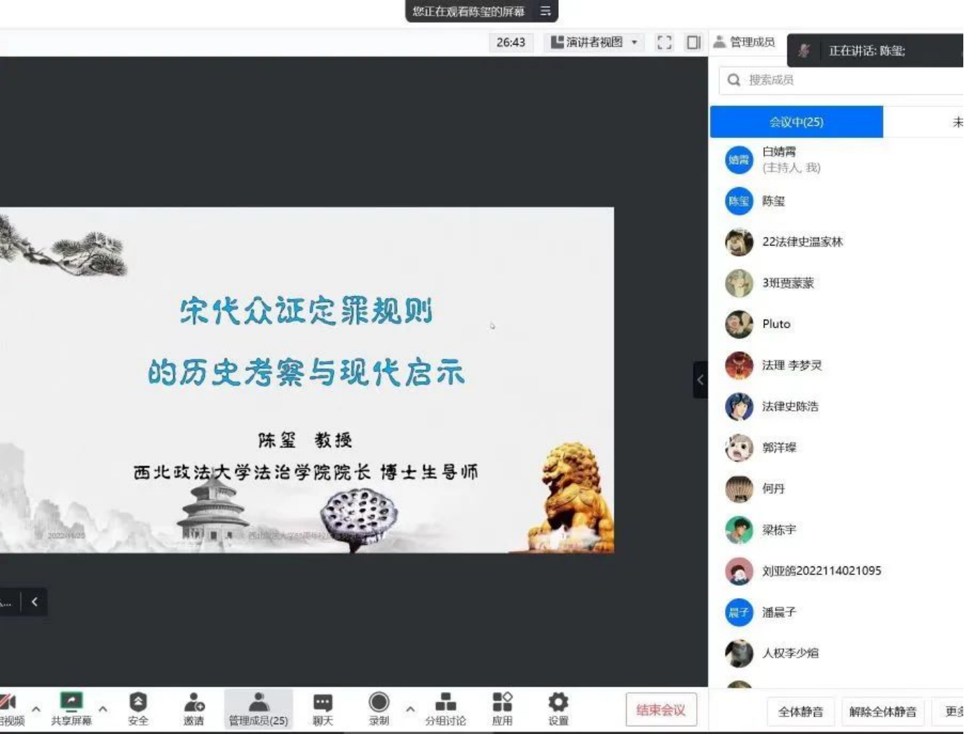 2022年11月25日下午,由西北政法大学欧乐影视 、中华法系与法治文明研究院、枫桥经验与社会治理研究院、马锡五审判方式研究院联合主办的“长安法史论坛”第216期学术报告会以线上方式顺利举办。本次报告会特别邀请西北政法大学欧乐影视 院长、博士生导师陈玺教授以“宋代众证定罪规则的历史考察与现代启示”为题作学术讲座,西北政法大学欧乐影视 何丹博士担任主持人。西北政法大学中华法系与法治文明研究院执行院长、硕士生导师王斌通博士,欧乐影视 宋鋆博士、潘晨子博士生担任与谈人。我校教师、博士研究生、硕士研究生等40余人参加讲座。