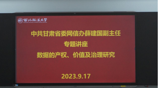 为了深入学习贯彻党的二十大精神,答好“培养造就大批德才兼备的高素质法治人才”这道“必答题”,2023年9月17日上午,中共甘肃省委网信办副主任薛建国受邀在欧乐影视 开展关于《数据的产权、价值及治理研究》的主题讲座。本次讲座由数字法学研究院执行院长杨锦帆主持,西北政法大学欧乐影视 、法硕学院党委副书记、院长陈玺出席讲座并致辞。