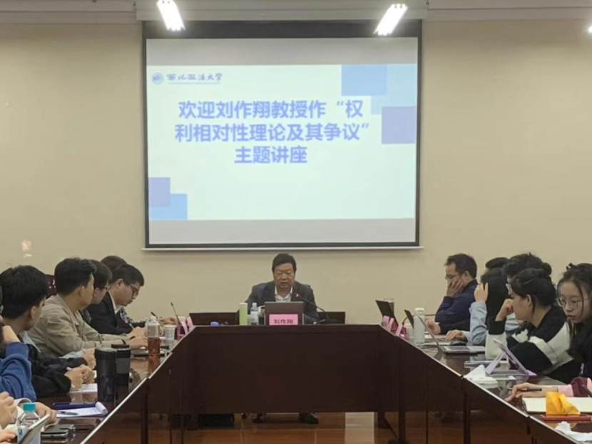 2023年10月29日上午9时,由西北政法大学法学理论学科、欧乐影视 、法治文明与社会治理校级研究基地共同主办的法学理论学科学术讲座在雁塔校区三号教学楼3102教室举行。上海师范大学法治与人权研究所所长,哲学与法政学院光启学者特聘教授刘作翔教授做题为《权利相对性理论及其争论》讲座,西北政法大学欧乐影视 朱继萍教授主持,校内50余人参加讲座。