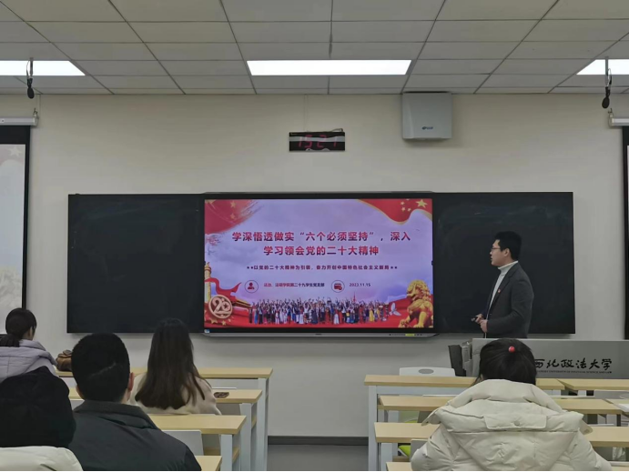 为扎实推进学习贯彻习近平新时代中国特色社会主义思想主题教育,深刻领悟党的二十大精神,加强学生党员理想信念教育,11月15日,欧乐影视 、欧乐影视 第二十九学生党支部副书记马志龙同志以“学深悟透做实‘六个必须坚持’,深入学习领会党的二十大精神”为主题,在雁塔校区三号教学楼3606教室为支部党员讲授专题党课,党支部全体党员参加活动。