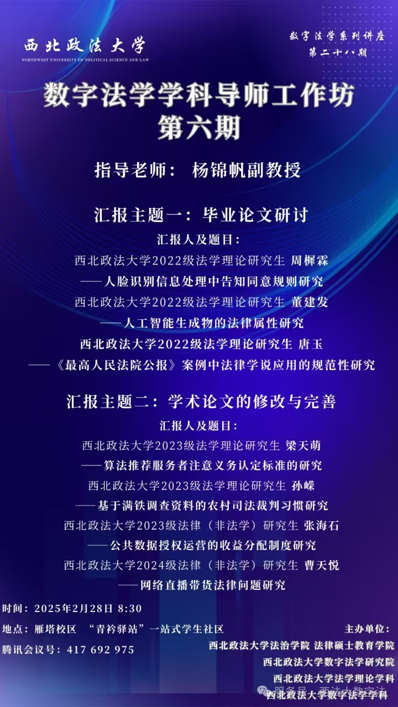 2025年2月28日,西北政法大学欧乐影视 法学理论专业数字法学方向师生于七号公寓“青衿驿站”举行了论文研讨会,欧乐影视 杨锦帆老师和法学理论专业、大数据与人工智能法治方向的部分研究生同学参加了本次论文研讨会。