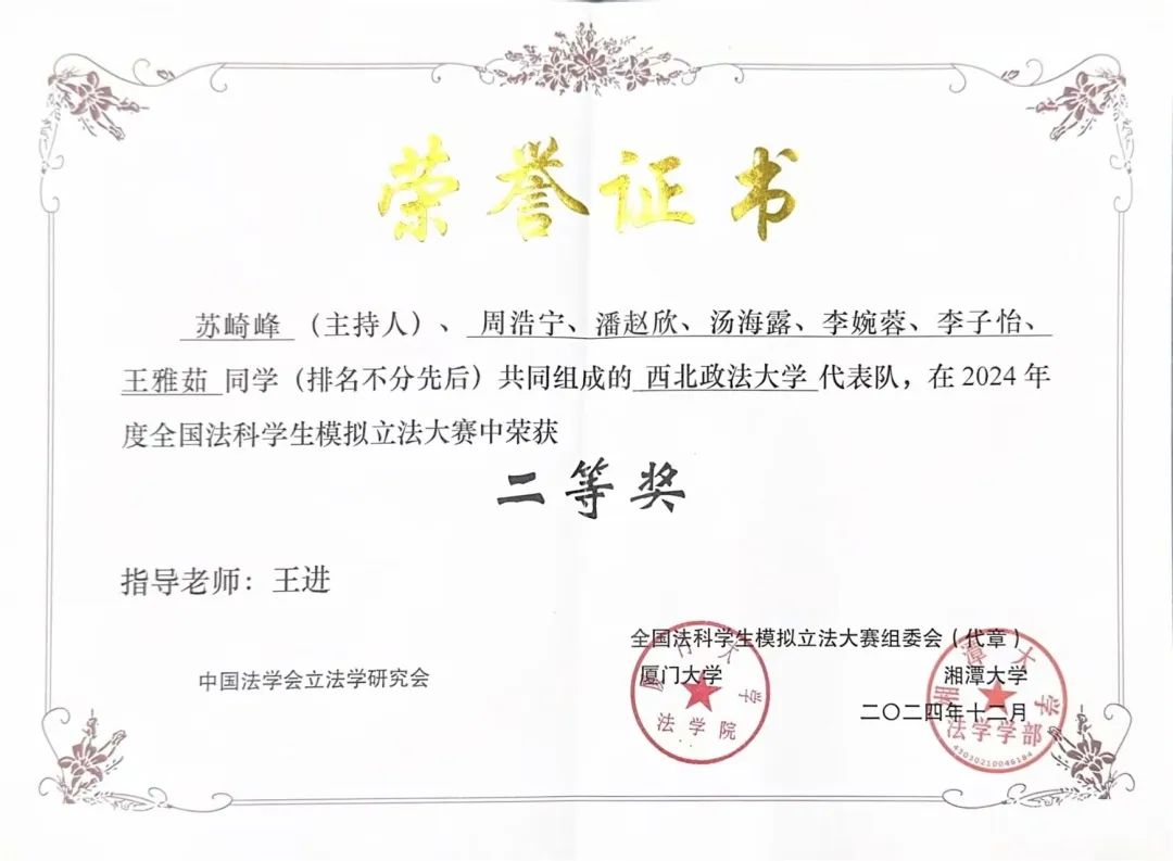 作为团队的法条撰写成员,能够参与本次立法大赛并荣获二等奖,我深感荣幸与振奋。这份荣誉离不开王老师的悉心指导、队友的协作支持以及赛事平台提供的实践机会。在这次备赛过程中,我们深入研读法律文本,系统锤炼法条起草技能,既体会到立法工作的严谨与温度,也感受到团队智慧碰撞产生的创新力量。此次经历不仅加深了我们对立法原理的理解,更强化了将理论与实践相结合的专业能力。