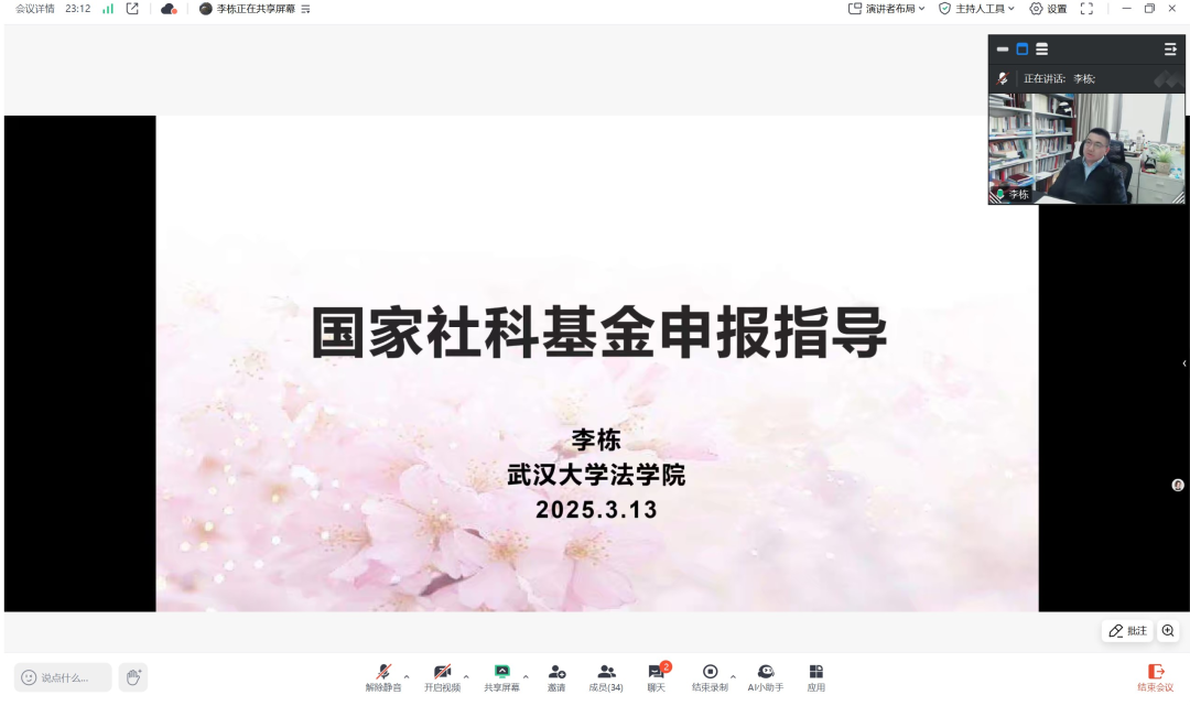 3月13日下午,武汉大学法学院博士生导师李栋教授作“国家社科基金项目申报指导”专题讲座,欧乐影视 院长陈玺主持会议,科研处副处长尚海洋、青年教师代表、博士生等近50余人参加讲座。