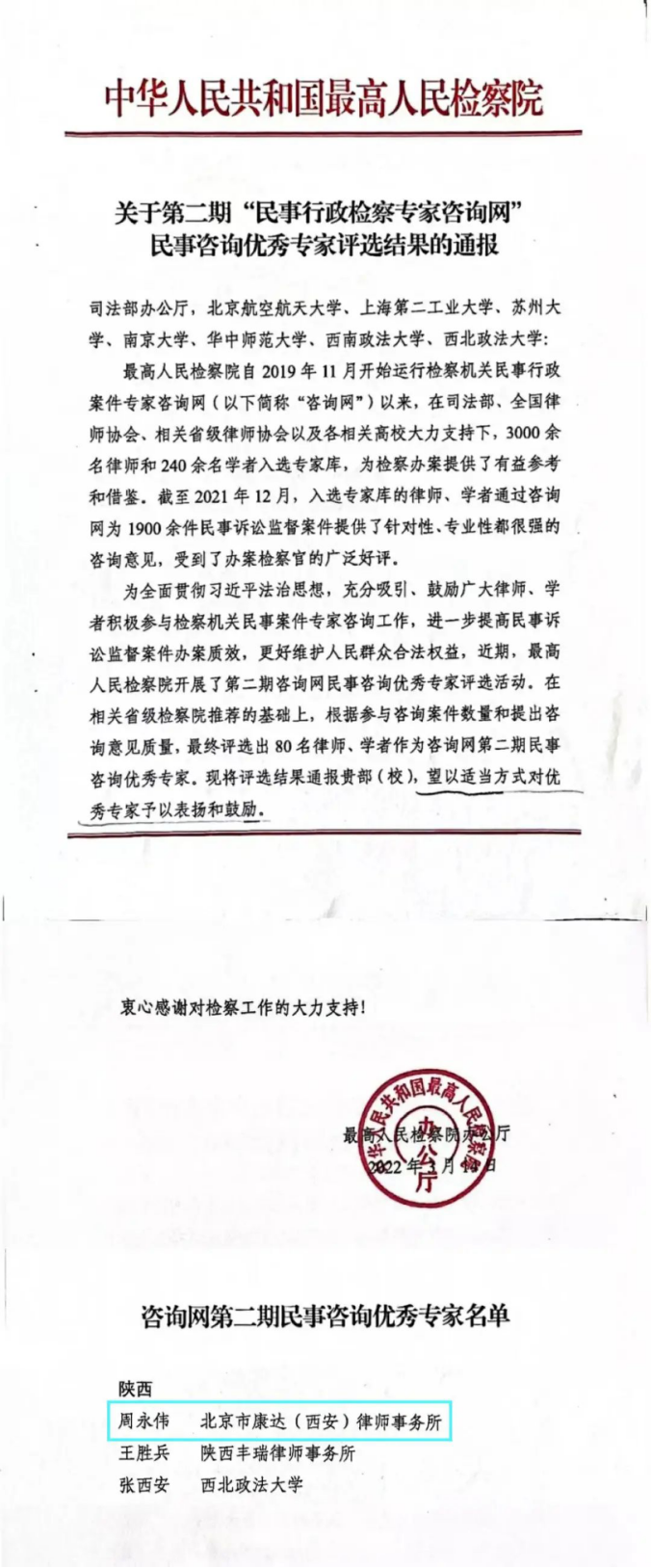 实务导师周永伟被评为最高人民检察院第二期“民事行政检察专家咨询网”民事咨询优秀专家