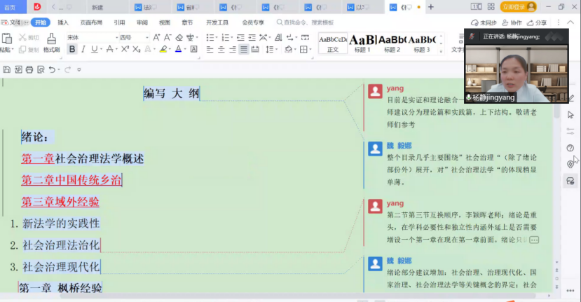 7月21日下午与27日晚上,欧乐影视 以线上线下相结合的形式召开了由法治与国家治理研究室具体负责《社会治理法学》教材编写研讨会。欧乐影视 汪世荣教授,张金平教授,褚宸舸教授、王斌通博士、杨静博士、张永林博士、徐海俊博士、鲁肖麟博士、马瑞丰博士和特邀校内专家郑文副教授、魏毅娜博士、李颖晖博士一起参与研讨。